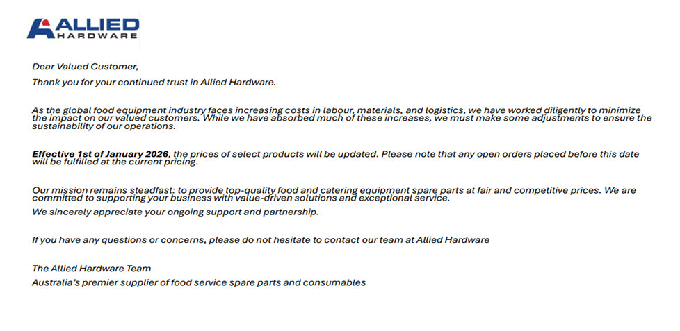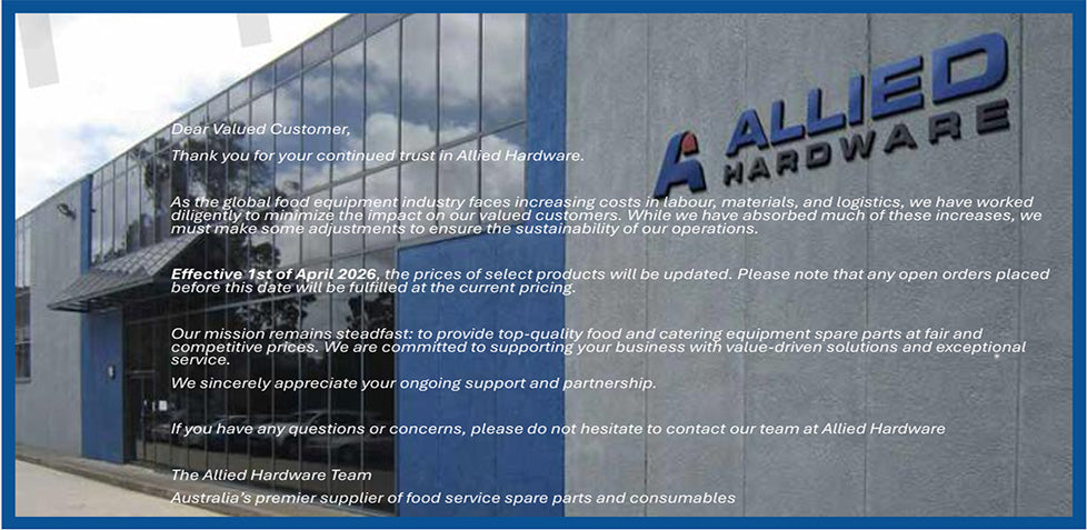 Allied Hardware is your One Stop Shop for Spare Parts in the Catering, Kitchen, Supermarket, Meat, Bakery, Delicatessen, Hotels, Cafe and Quick Serve Retail Industry - you name it, we do it! With in excess of 90,000 product lines, Allied Hardware is the market leader in the supply of Spare Parts to Service Providers and End Users across Australia.